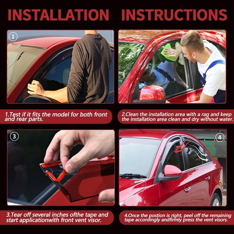- Easy Peel-N-Stick Installation: With the direct tape-on design, these window deflectors are incredibly easy to install. No cutting or drilling required—simply peel and stick, and you're good to go! The automotive-grade tape ensures a strong bond, and it can be easily removed without damaging your vehicle’s appearance.