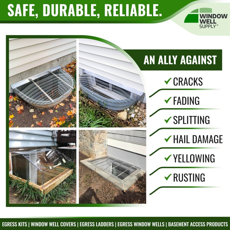 • CUSTOM FIT FOR VARIOUS SIZED WELLS: Recognizing that one size doesn't fit all, our polycarbonate egress window well covers are tailored to fit various sized wells. Whether you're covering a splash guard or securing a large basement window well, Window Well Supply ensures a great fit for your home, providing top-tier protection and aesthetic appeal.