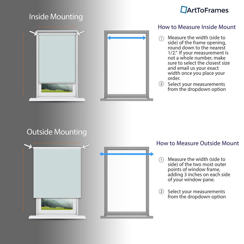 - Our Roller Shades can be mounted via an inside OR outside mount. Please see description below for detailed instructions on how to measure your window.