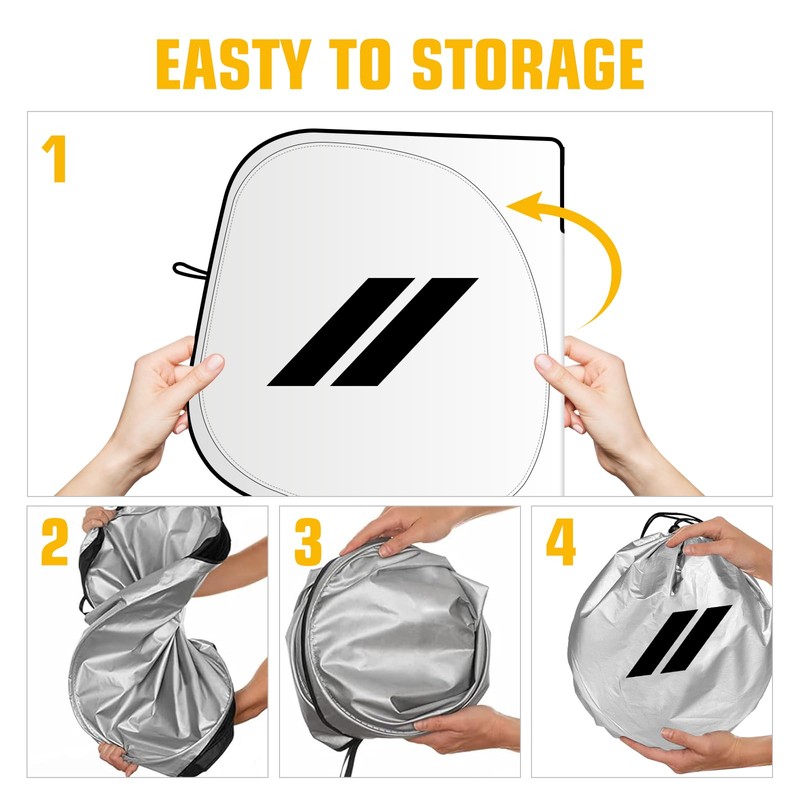 - 【Easy to Install & Foldable to Store】All you need to do is put the sun shade over the entire windshield, put the visor down and press down, then tighten the Velcro on the sun shade. It's an easy job. The windshield shield has an elastic memory line, which can be bent and folded into the storage bag, does not take up space, and will not be deformed when used again.You can easily tuck the windshield cover sun shade into your door pocket