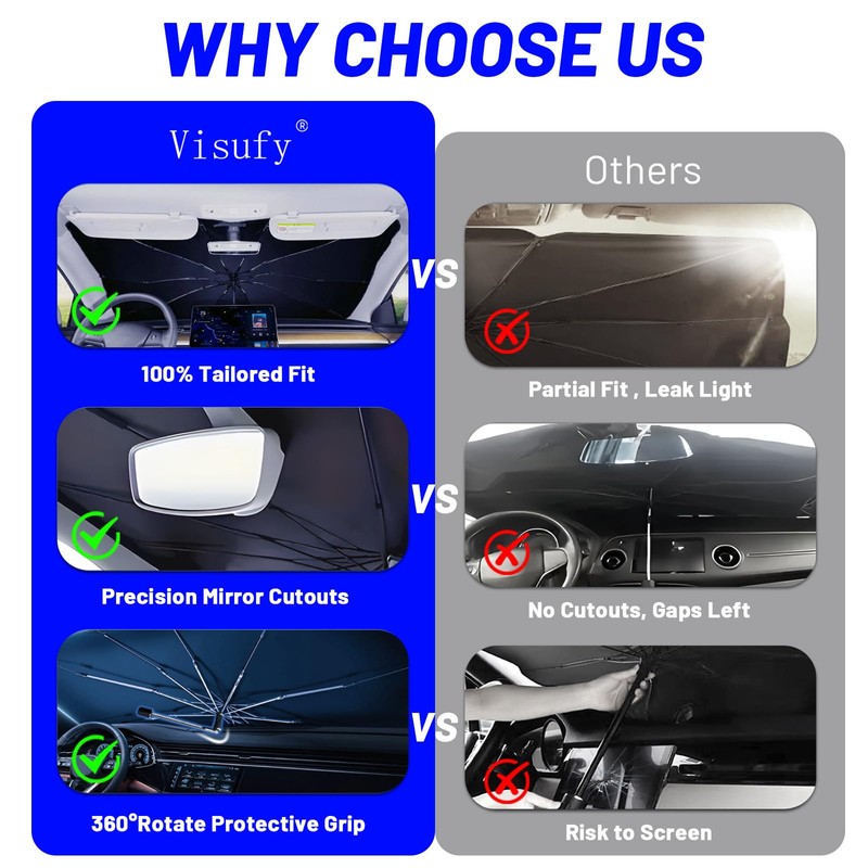 - Easy to Use and Compact to Store: Visufy car front window shade opens effortlessly like an umbrella and pops up in seconds. Its lightweight, collapsible design allows it to be neatly stored in your car’s glove compartment or door pocket