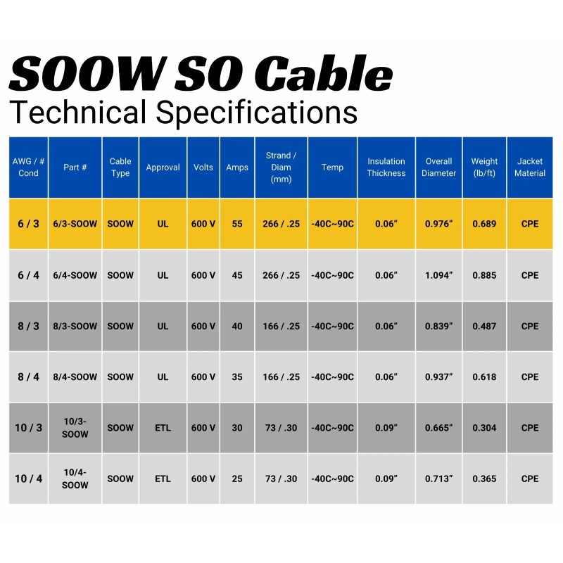 SOOW cable is a versatile multi-conductor power cable designed for use in industrial and other demanding applications, including heavy equipment, construction machinery, motors and welding leads, portable lighting, battery chargers, shallow water immersion, and mining environments. This SOOW cable is UL62 approved.