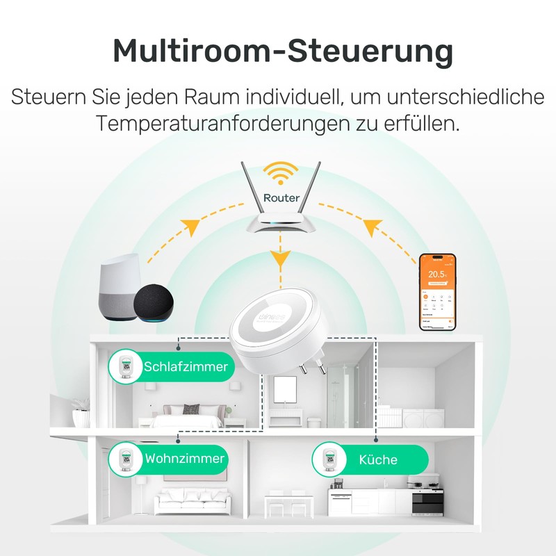 - Flexible control: 1. Set the temperature directly on the radiator thermostat; 2. Set the temperature remotely in the AiDot app via the WiFi room thermostat; 3. Operate via voice via Amazon Alexa or Google Assistant. Easily control the temperature of each individual room