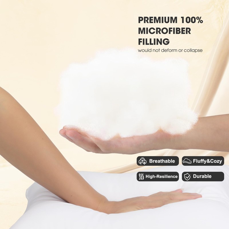 - 🌟HIGH-QUALITY INNOVATIVE MATERIAL: The pillow core is made with an exclusive, cutting-edge synthetic fiber that surpasses real down in softness and lightness, not only does it protect the environment but also hypoallergenic properties.