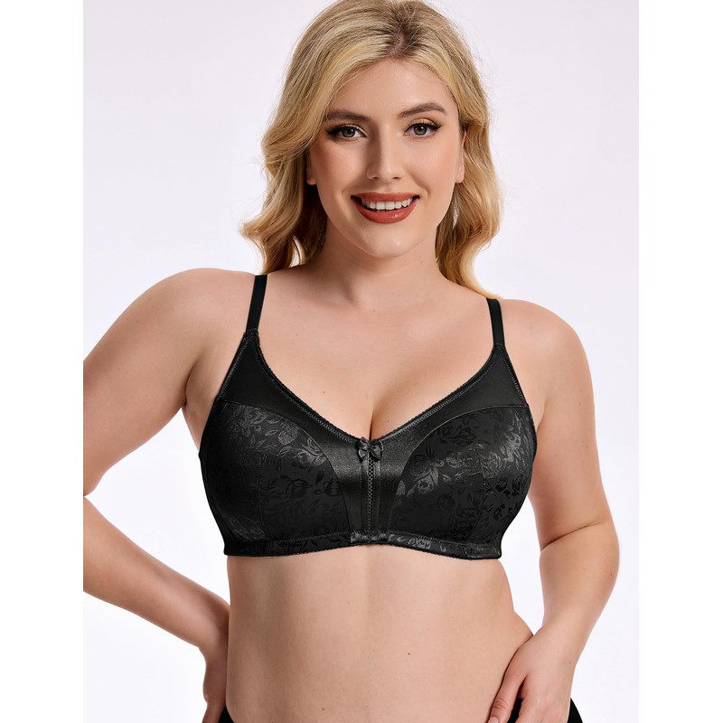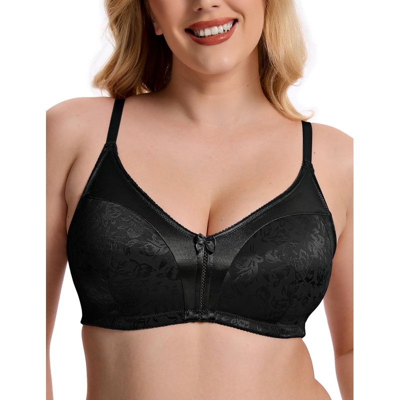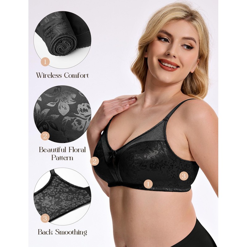 Wingslove Women's Full Coverage Wireless Bra Non Padded Comfort Minimizer Bras Plus Size Floral Pattern Support (Black,36B)
