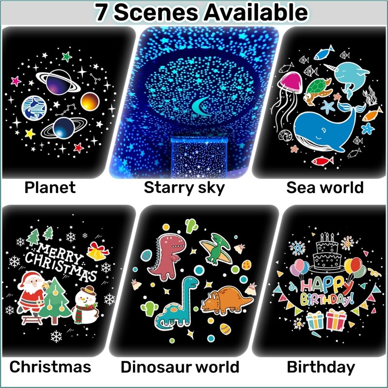 - 【Colourful Design】: This Kids Dinosaur Projector comes with upgraded colorful LED bulbs. Compared to other similar products, it projects a much wider range and generates much brighter light. With 6 different modes (Starry sky, Merry Christmas, sea world, dinosaur world, happy birthday, planet), it creates colorful dream scenes. Infinitely dimmable brightness meets children's various lighting needs.