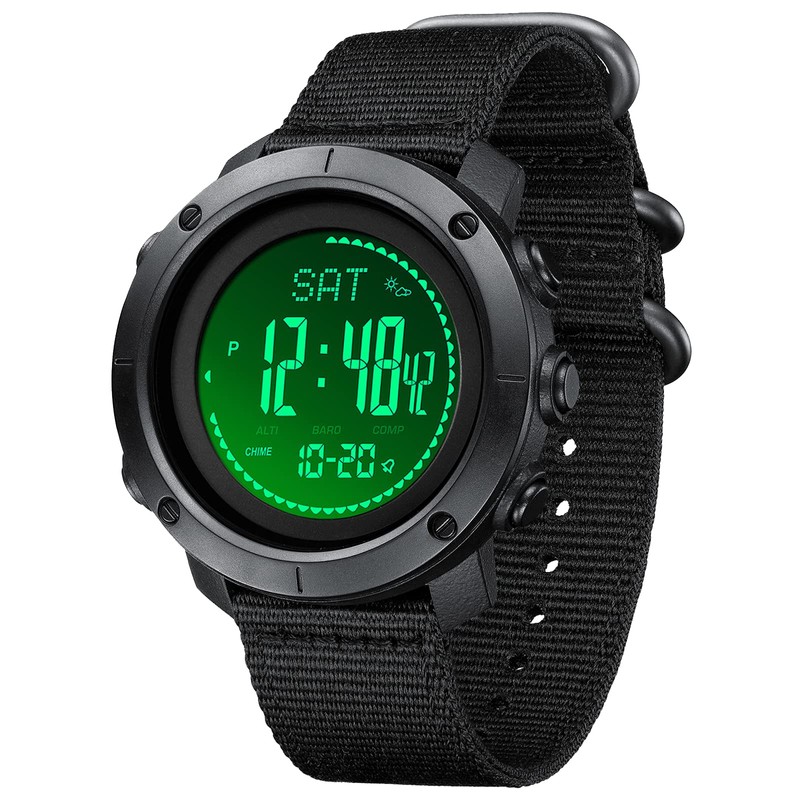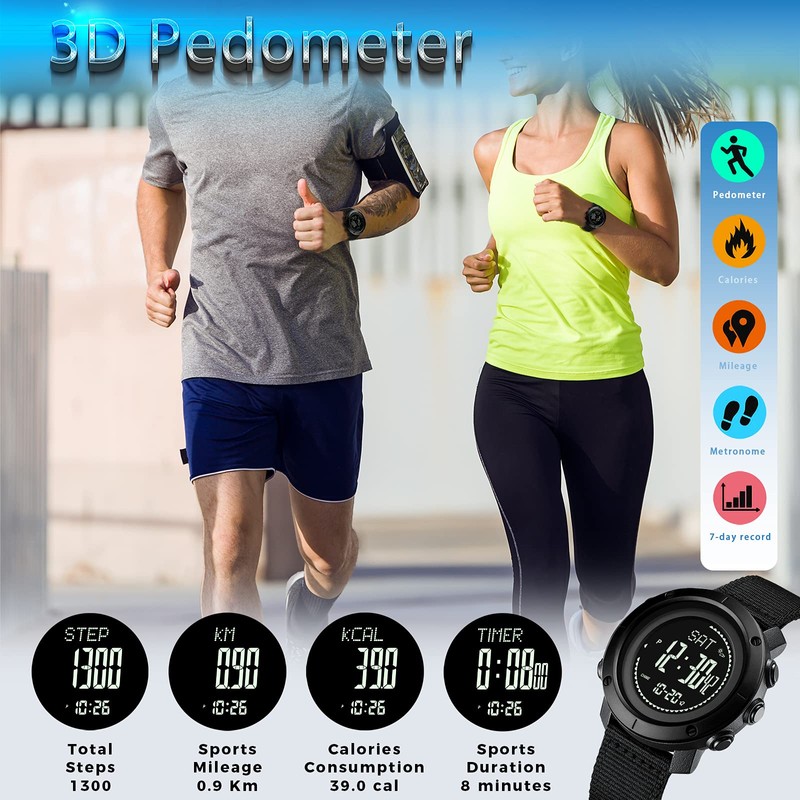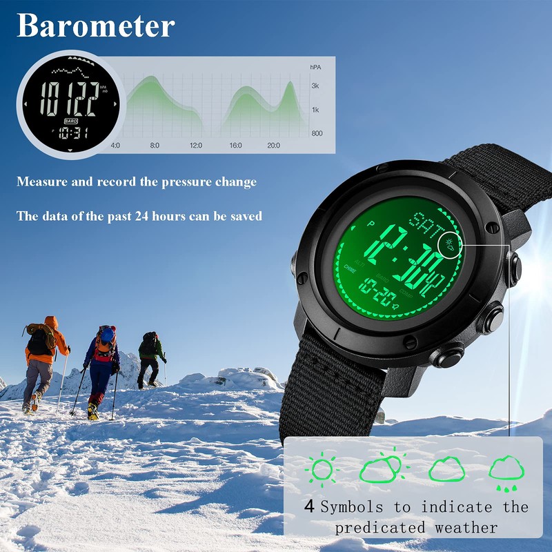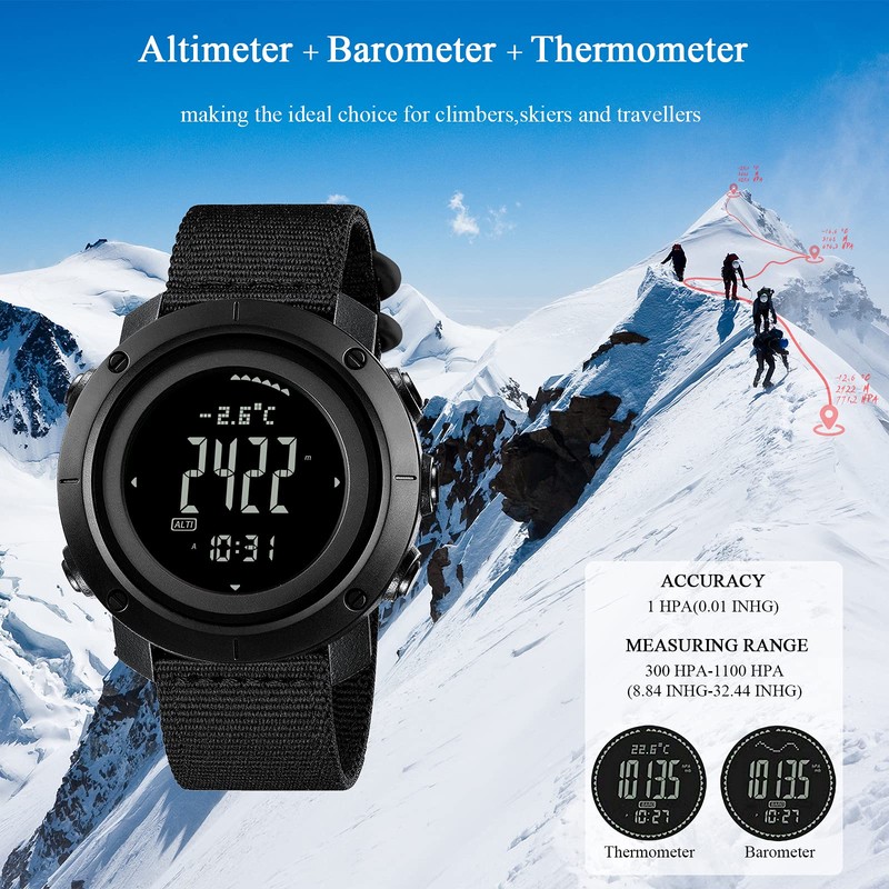 - Military Watch : Built-in altimeter (-700~9000m) + barometer (300~1100hPa) + compass (±1°)+Thermometer(-10~60℃); Get altitude, ambient air pressure and your heading,And predict weather trends through data,Real-time control allows you to change itinerary,Tactical watches for climbers, skiers, outdoor traversers, hikers,etc.