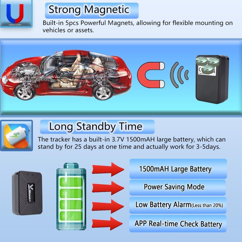 Posicionamiento en tiempo real, vibration alarm, low battery alarm, moving alarm, overspeed alarm,Geo-Fence,Imán fuerte,IP65,GPS resistente al agua también viene con un micrófono oculto que puede habilitar la función de monitoreo cuando sea necesario para monitorear los sonidos alrededor. el dispositivo. (Esta función no se puede habilitar usando la tarjeta SIM A1 incluida)