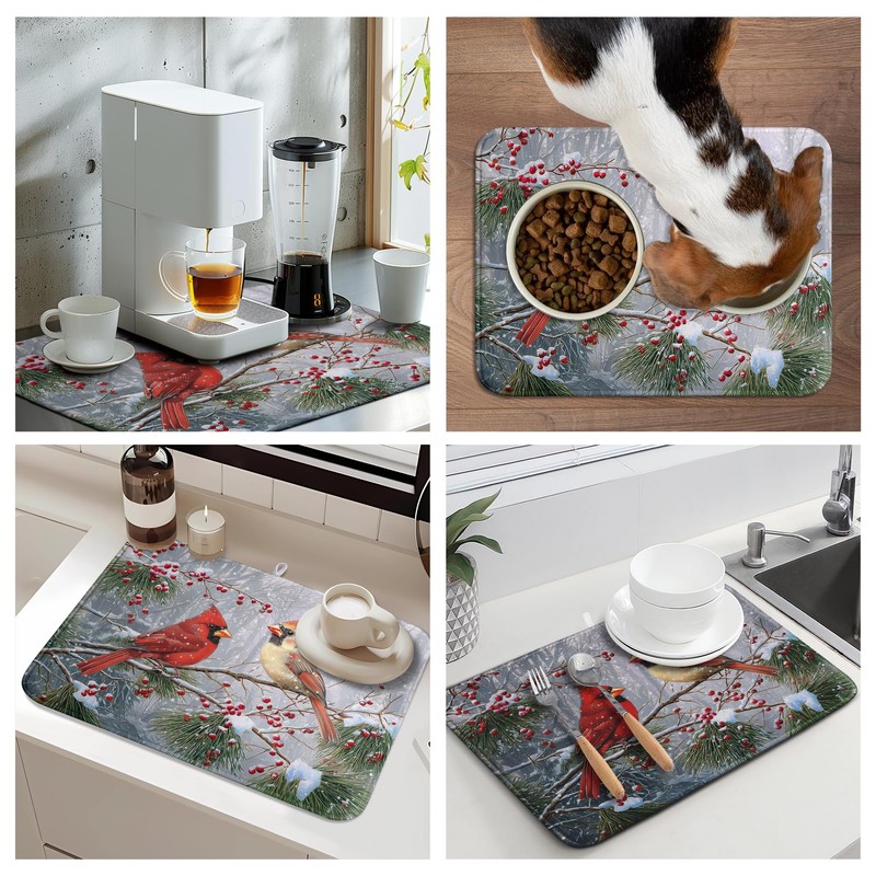 - [Multi-functional]: This cardinal large drying mat for kitchen counter can be placed under the dish rack to collect dripping water to keep the counter dry and clean, or you can place bottles, pots, plates, bowls, cups and other utensils directly on the mat.Winter kitchen mat Christmas dish drying mat can also be placed under the machine to absorb spilled。