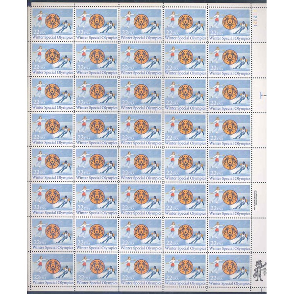 This is a complete sheet of 40 stamps as pictured. Issued in 1985, the USPS commemorated the 1985 Winter Special Olympics. Some 850 young athletes attended the winter games, which included skiing in Park City, Utah, and speed and figure skating in Salt Lake City.