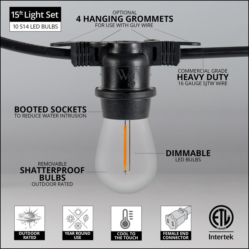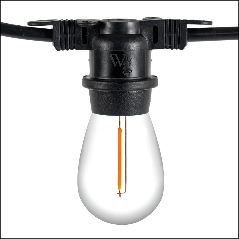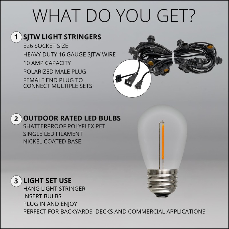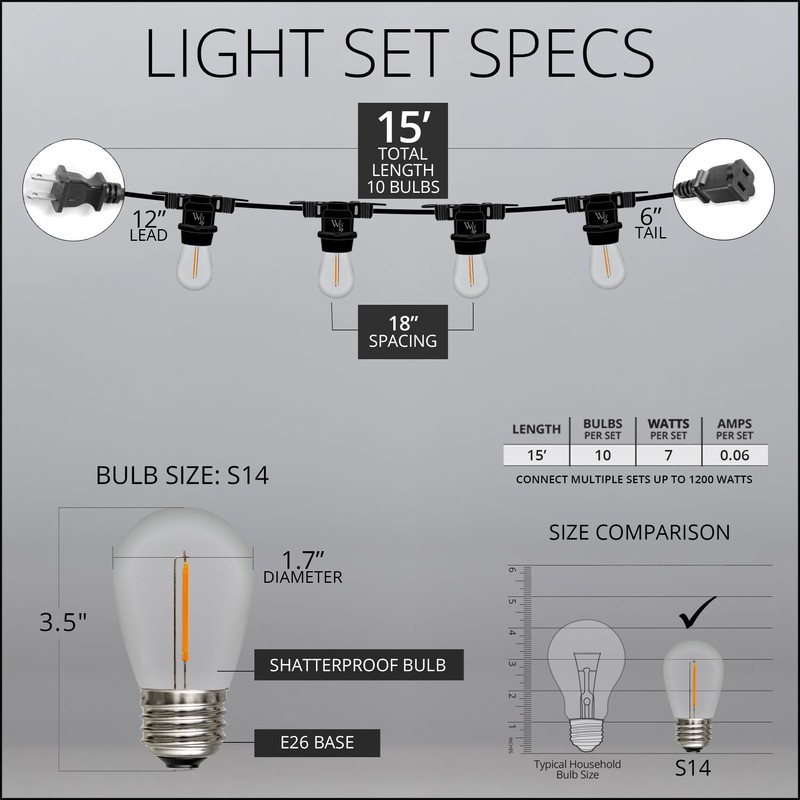 - [ S14 SHATTERPROOF EDISON BULB PATIO LIGHTS ON COMMERCIAL BLACK WIRE ] This set includes transparent polycarbonate S14 LED filament bulbs and commercial grade black patio stringer, 12-inch lead with polarized male plug and 6-inch tail with female plug for easy end to end connections. E26 bulb base and socket size (same as standard household light bulbs). To assemble, simply twist bulbs into sockets.