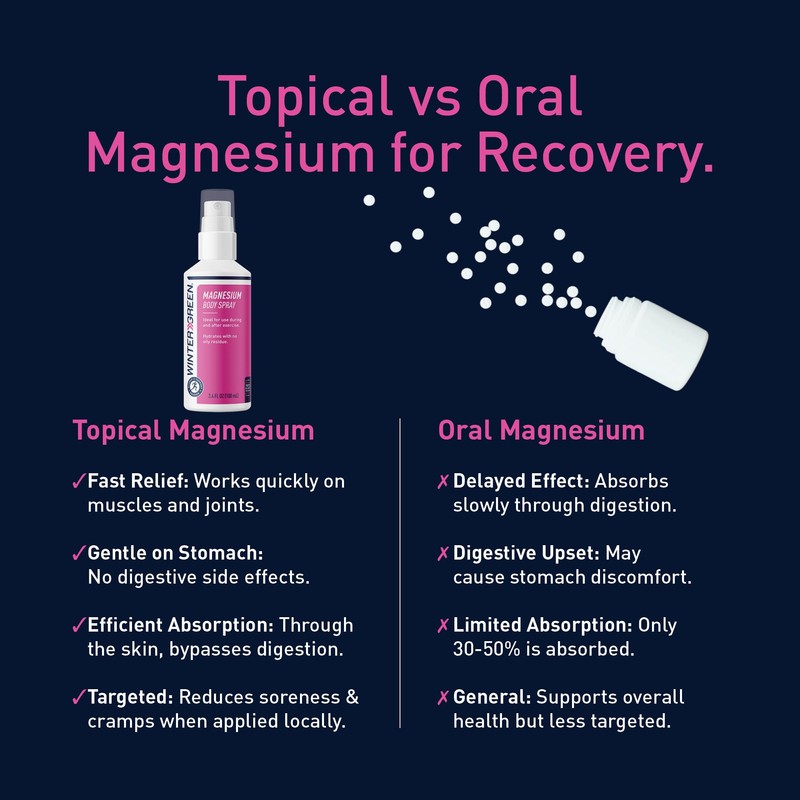 Wintergreen Magnesium Body Spray, 3.4 fl oz – Fast-Absorbing Recovery Mist for Pain Relief, Cramping, and Muscle Recovery, Non-Greasy Formula for Post-Exercise or Sports