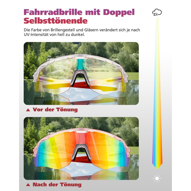 - Double discolouration technology: compared to conventional self-tinting sunglasses, our cycling glasses not only change the tint of the lenses automatically depending on the incidence of light, but also adapts the colour of the frame to the ambient lighting. This allows intelligent, holistic discolouration of the sports glasses - for a synchronous change of viewing experience and style.