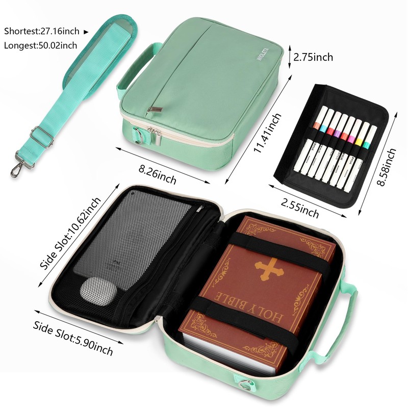 WIOLETA Bible Cover Case for Women, Bible Case with Shoulder Strap, Bible Carrier Bible Bag Carrying Church Bag with Pen Slots and Zippered Pockets, Bible Purse for Lady Men, Mint Green