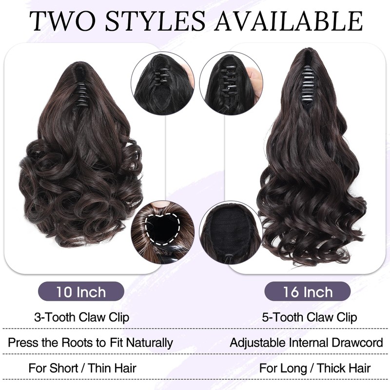 - [Two Length Options]:There are 2 lengths, 10" and 16", ponytail clip in hair extensions, suitable for thin hair, insufficient hair volume, or a lack of novel hairstyles.It can be tied high or low. This ponytail is the best choice; wear it instantly without wasting time. Say goodbye to expensive and time-consuming salon appointments