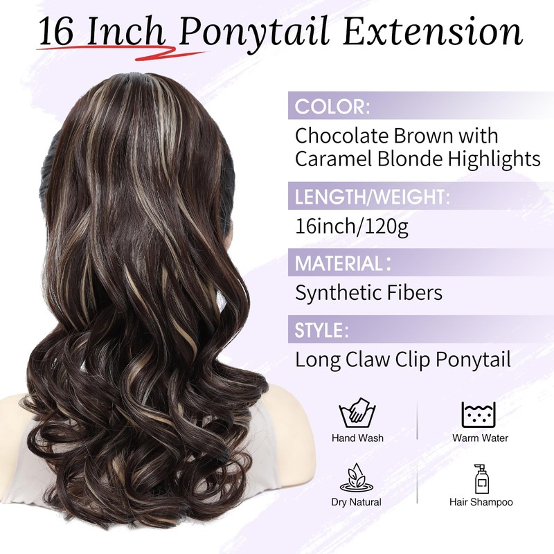 Wirctp Ponytail Extension,16" Claw Clip in Ponytail Extensions Long Curly Ponytail Hairpiece for Women Fluffy Natural Synthetic Pony Tails for Daily Use(Chocolate Brown with Caramel Blonde Highlights)