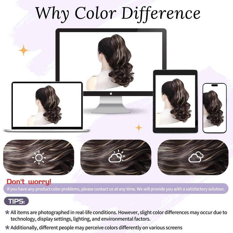 - [Tips]:Due to the influence of light, environment, monitor settings, and other factors, the color of the claw clip ponytail extension displayed may be different from the actual product. Please refer to the actual product. We are committed to customer satisfaction and providing high-quality products. If you have any questions, please feel free to contact us