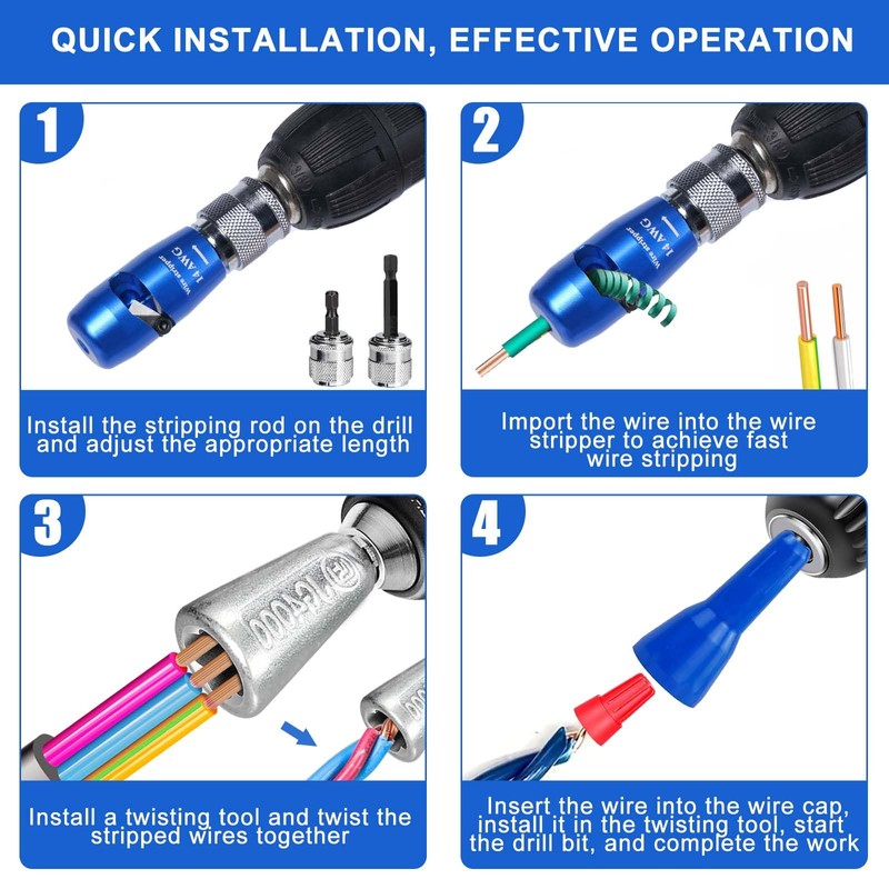 1.Cleverly designed and versatile, this AWG wire stripper tool set is perfect for a variety of applications, from quick wire stripping to precision twisting. The wire stripper attaches easily to a power drill for quick and easy wire stripping and twisting, saving you time and energy
