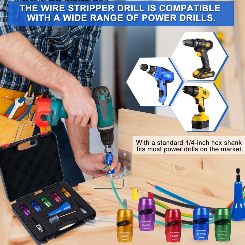 - Standards Wire Stripping and Twisting Tools: Our Electric Wire Stripper are designed and manufactured specifically for wire and cable! Simply attaching wire strippers to a drill allows for quick wire stripping in a matter of seconds, which I'm sure is simply fantastic for most people who value efficiency very highly. Save you valuable time and enjoy the joy of efficient work