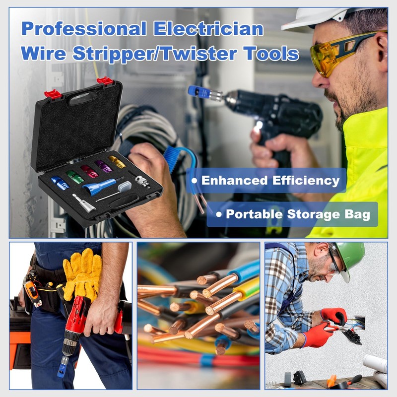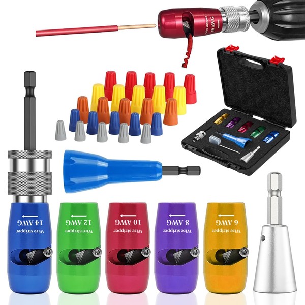 - Portable Storage Box: This set can meet most wire stripping, twisting needs. With a storage box to protect the tools and work out more neatly. PACKAGE INCLUDES: a telescopic connector, a 6 AWG Stripper head, a 8 AWG stripper head, a 10 AWG stripper head, a 12 AWG stripper head, a 14 AWG stripper head, a wire twister, a wire nut twister, wire nut x 25, a replacement blade, a hex tool x 1, a storage box.