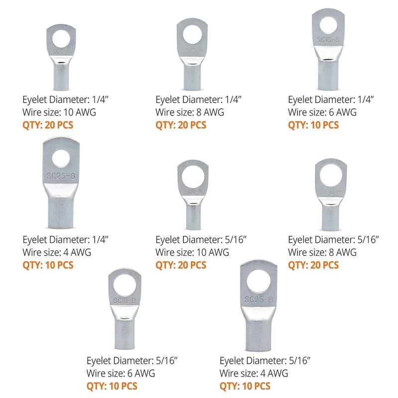 • MOST POPULAR SIZES INCLUDED - This versatile kit of wire lugs will work with 10, 8, 6, 4 gauge wires. We included 1/4" and 5/16" ring eyelets for each wire gauge size.