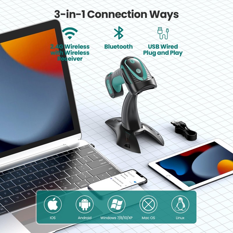 - Barcode Scanner with 3-in-1 Connections and Widely Compatible: This heavy duty barcode scanner can work with bluetooth & 2.4G wireless & usb wired. Barcode Scanner can be connected with a variety of devices, such as phone, computers, POS, iPads. In addition, it is also compatible with various operating systems, such as Android, iOS, Linux, Windows. Wireless Barcode Scanner can be widely used in inventory, supermarkets, shopping malls, retail industry, logistics and medical institutions.