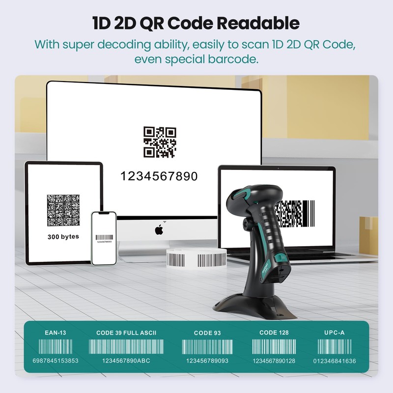- Recongnizable Digital/Printed 1D 2D QR Barcode: 1D Decode Capability: Codabar, Code 11, Code93, MSI, Code 128, UCC/EAN-128, Code 39, EAN-8, EAN-13, UPC-A, ISBN, Industrial 25, Interleaved 25, Standard 25, 2/5 Matrix, ITF-14; 2D Decode Capability: QR, PDF417, Data Matrix, Aztec code, Maxi Code. Wireless barcode scanner can read barcode displayed on computer monitor. Even some of damaged, blurring, incomplete, fuzzy and reflective barcodes can be decoded.