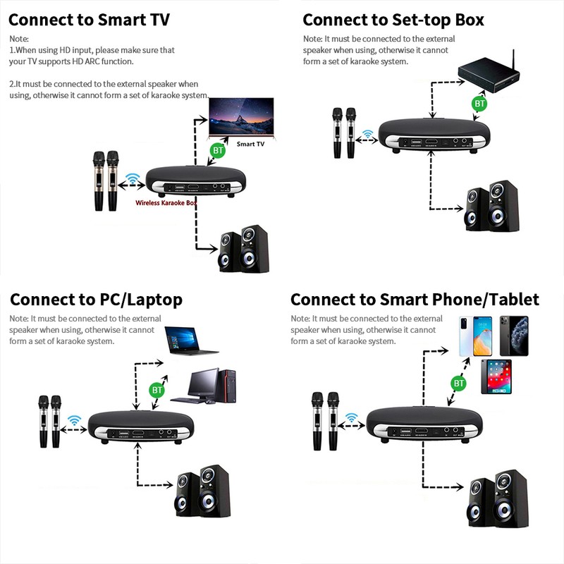 1、Adopt BT 5.0 technology, fast wireless sound transfer speed, low loss. 2、Built in high performance professional digital processing chip, stable current frequency, clear and noiseless. 3、The cardioid microphone effectively isolates the sound source from subtle background noise. 4、Equipped with multiple ports to connect different devices. 5、Compatible with TV, set top box, projector, desktop computer, laptop, tablet, smart phone, etc.