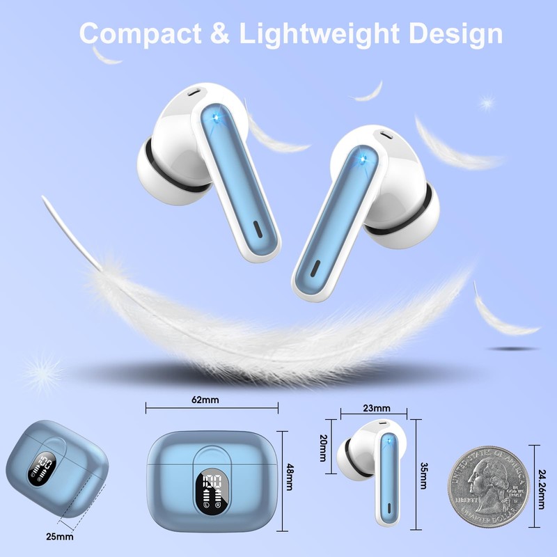 - Immersive Sound and ENC Noise Cancelling Mics: These wireless earphones adopt a unique stereo design with 13mm big composite diaphragms and AAC codec to produce professional-grade sound. The bluetooth headphones are equipped with ENC noise reduction double mics to passively cancel 80% of background noise, allowing you and the caller to hear each other better and make crystal-clear calls with minimal background noise.