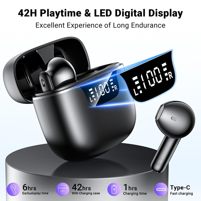 - LED Display/42 Hours Playtime: Our earbuds are designed with dual LED digital display to accurately display the power status of the charging case and earbuds. In addition, the Wireless Headphones can play for up to 5-6 hours on a single charge, with a total battery life of 42 hours, meeting almost all daily life needs