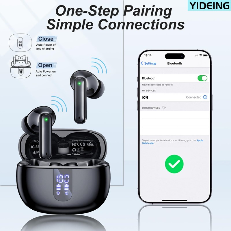- Advanced V5.3 Chip & Bluetooth One-Step Pairing: K9 wireless headset adopts advanced Bluetooth 5.3 chip, which makes the Bluetooth headset connection faster and more stable, and reduces the noise interference more efficiently; take out the headset from the charging case, open the Bluetooth settings of the cell phone, and then connect to the headset “K9”, then the connection can be realized automatically.