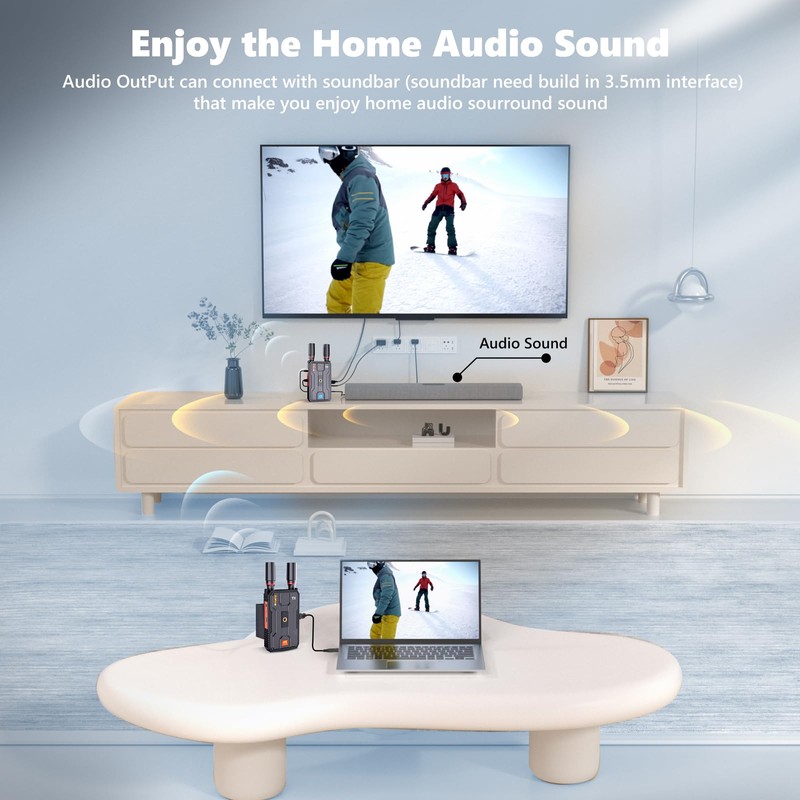 - 【Audio Interface】Wireless HDMI Kit build in Audio interface that you can connect with soundbar/speaker(soundbar/speaker build in 3.5mm audio interface). Enjoy the home audio sound