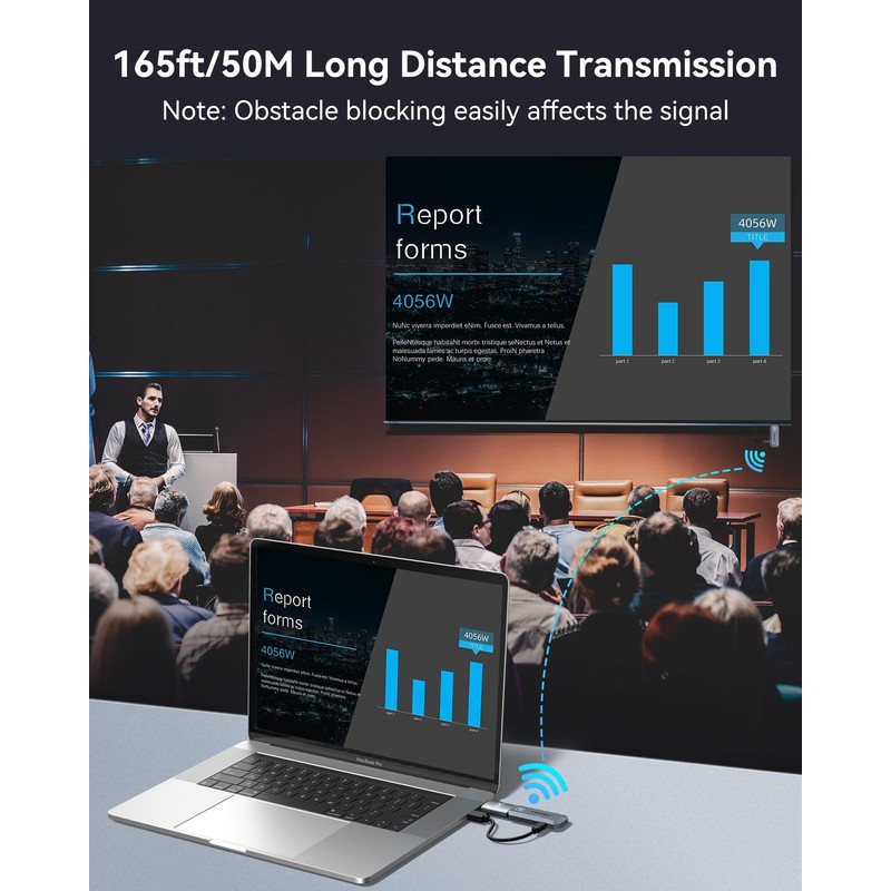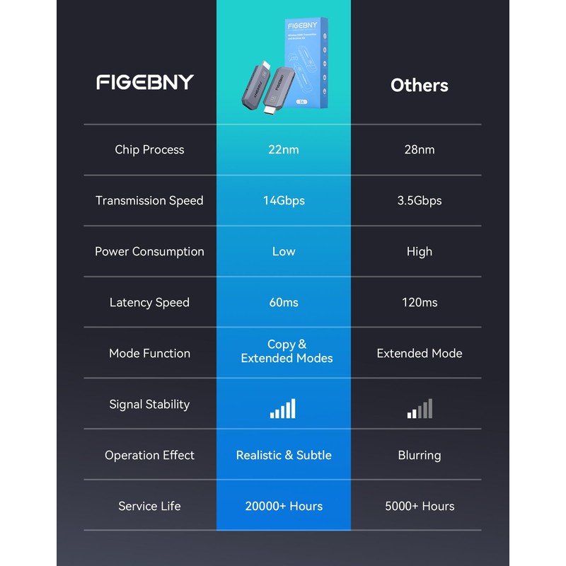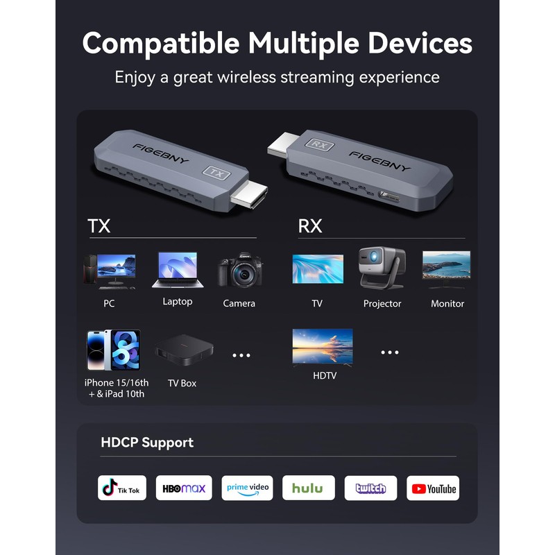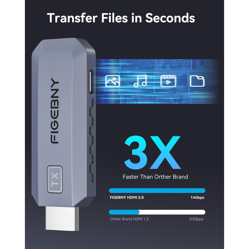 - 165ft/50m Wireless Range: Equipped with a dual-band 2.4G/5G chipset , FIGEBNY wireless hdmi extender achieves up to 165 ft (50 meters) of wireless transmission in open spaces. Walls or obstacles may reduce range and speed, but the robust signal maintains reliability for most home or office setups.