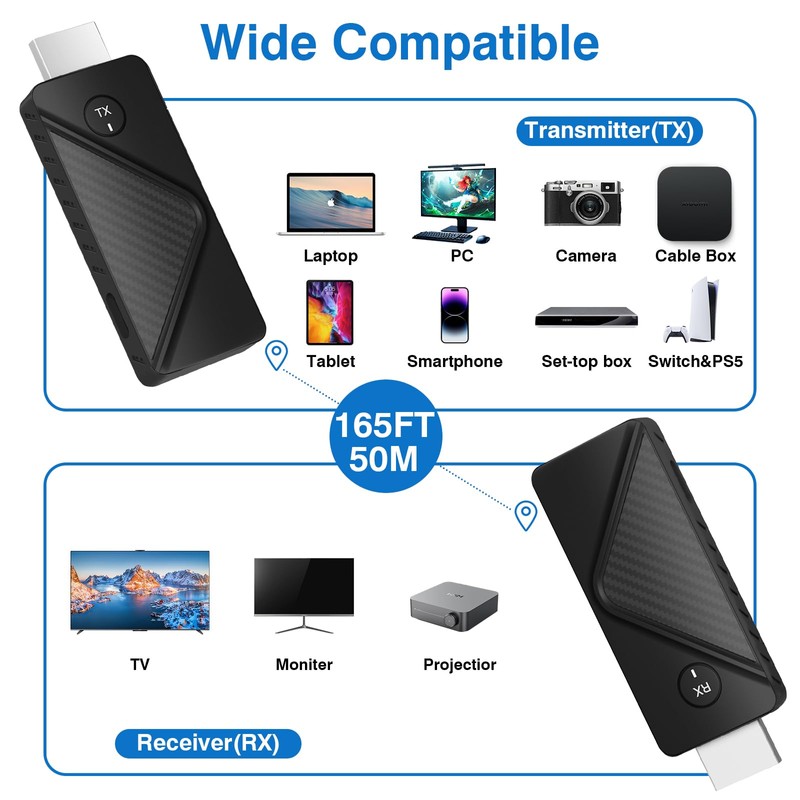 - 【165 FT/50M Long Range Transmission】: Wireless HDMI transmission distances up to 165 ft/50(Pro) meters. Built-in advanced dual-band chip (2.4G and 5G), strong anti-interference, stable signal transmission. It maintains a reliable connection even through walls and obstacles.