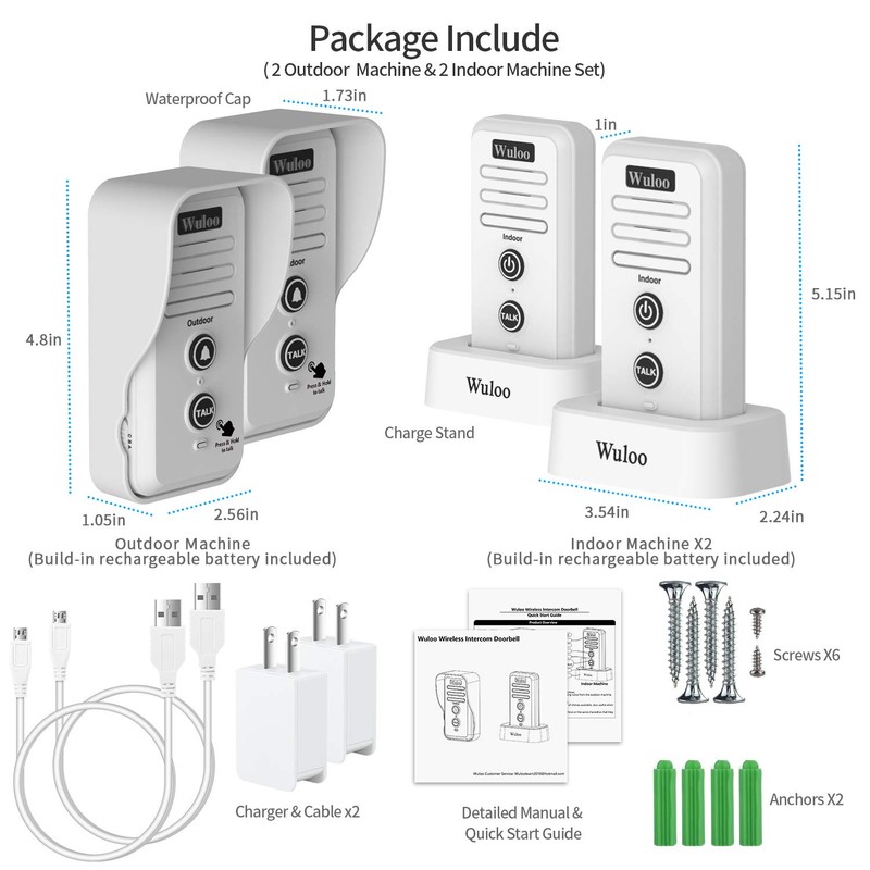 - [IPX55 Waterproof and Built-in Rechargeable Battery] The Wuloo intercom doorbell is waterproof even in bad weather conditions like snow and rainstorms. Features low power consumption, built-in 2000mA battery, and an included charging base! Full battery lasts 4-6 months for the transmitter, and indoor machine lasts 1-2 days on a full charge.
