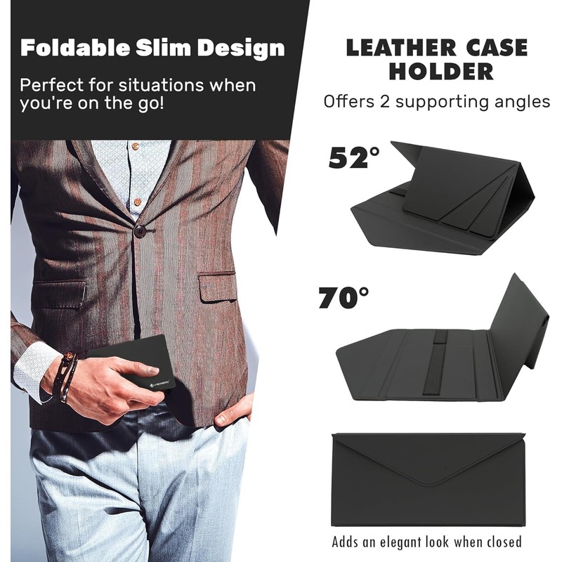 - Includes a leather holder protective case that offers 52° and 70° standing support for your device