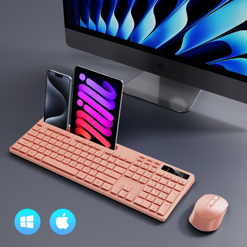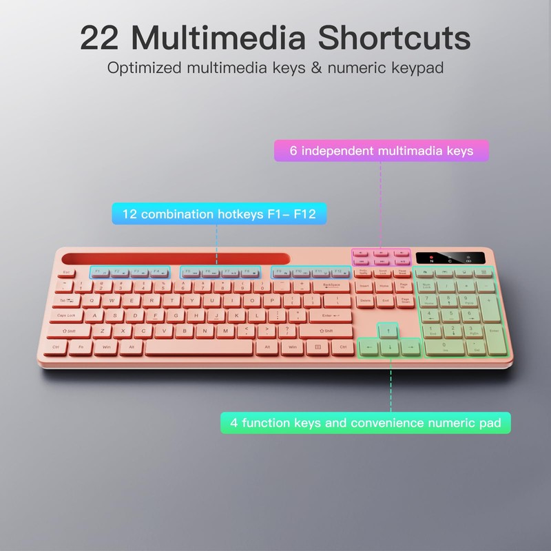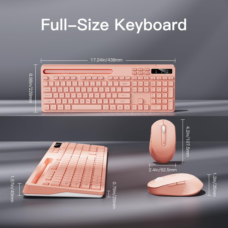 Wireless Keyboard and Mouse Combo, Soueto 2.4G Full-Sized Computer Keyboard with Phone Tablet Holder, 22 Multimedia Shortcuts, Numeric Keypad, 6 Button Silent Mouse for Windows, Mac (Cherry Pink)