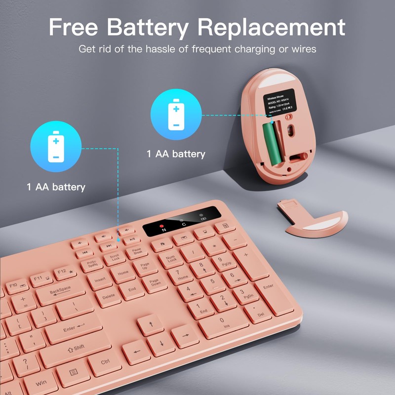• Both the keyboard and mouse feature a power switch and smart sleep mode for energy efficiency. You can go for months without the hassle of replacing the batteries. The wireless keyboard and mouse each require 1 AA battery. (Battery Not Included)