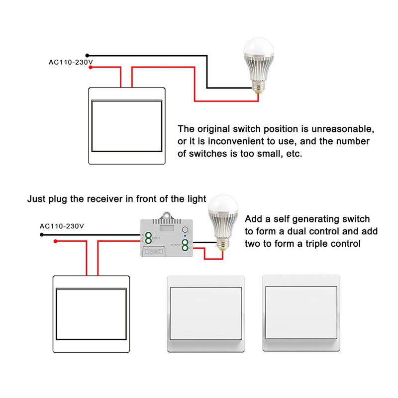 1、EK Power Generation: The 86 switch has a built in EK energy power generation module, no battery, no wiring, beautiful and generous, and can be placed at will. 2、Waterproof: The switch panel is safer without electricity and waterproof, the panel can be operated with wet hands, and there is no hazard of electric shock. 3、Multifunction: It can be attached to the wall or moved at will, and there is no problem in placing it on the table, bedside, or living room. You can use one random sticker to control multiple switches to turn off the lights of the whole house with one button. 4、Ultra Long Remote Control Distance: Ultra high sensitivity, receiving distance: 200m (outdoor), 50m (indoor). 5、Stable Remote Control: The receiver adopts one fire and one zero design, which can solve the strobe problem and make the remote control more stable.