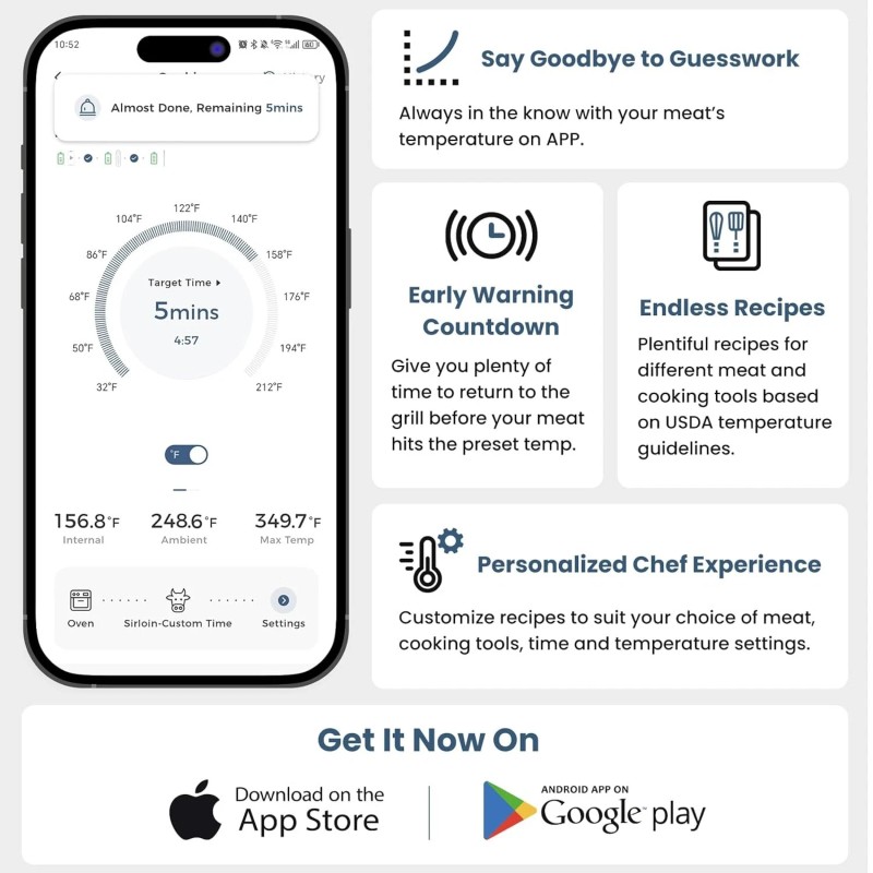• [Cook Smarter and Dual Alarm]: Effortlessly manage your cooking with our user-friendly APP. Accurately read the temperature of the meat and the heat of the grill. When the heat reaches the preset temperature from a distance, both the hub and the app will sound an alarm to you simultaneously. Ideal for beginners, easily prepare beef, veal, lamb, turkey, pork, fish, and more with precision and ease.