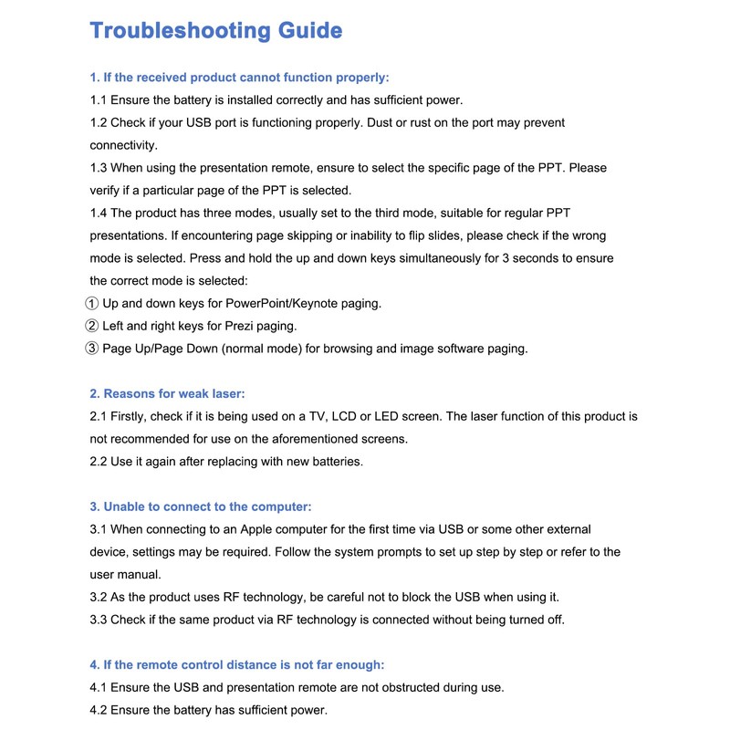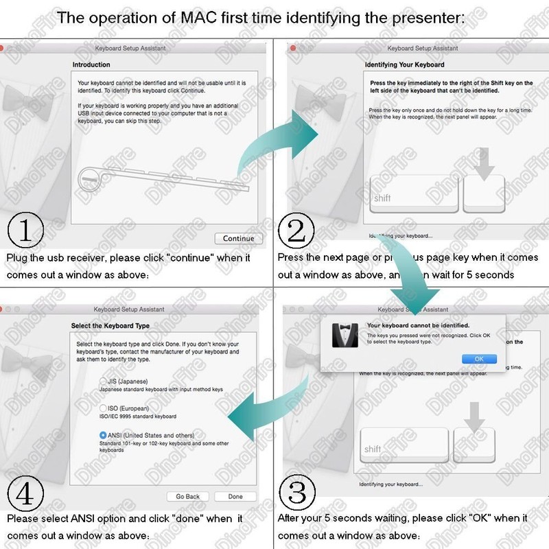- Presenter support options: Windows 2003, XP, Windows Vista, Windows7, Windows 8, Windows 10, Mac OS (For MacBook on OS X, plug the usb receiver into laptop, it will come out a box, and then you can select 101or104 option), Linux, Android