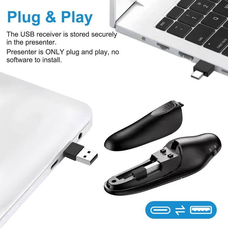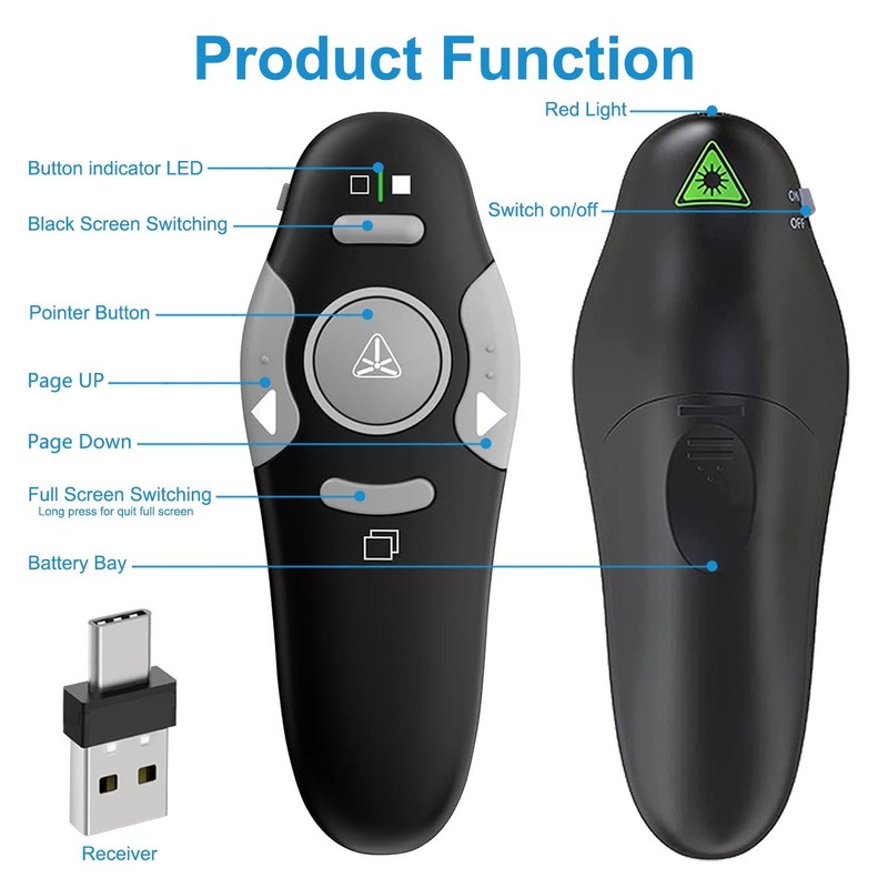 - 【Presenter Clicker Features】The compact size and ergonomic design allow you to hold presentation pointer presenter comfortably in your hand and easily fit into your pocket. Our power point clicker has 5 buttons, you can easily find the buttons. One-touch button design allows you to easily control the slideshow. The USB receiver stores inside of the computer clicker, so you don't worry about losing it.