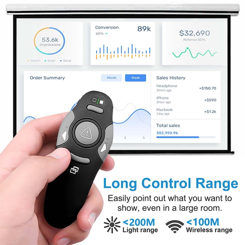- 【Bright Red Light & Long Distance Control】This remote clicker for presentations has bright red light that is easy to see against most backgrounds(Not recommended for TV/LED/LCD screen). The ppt clicker control range: 326FT/100M, Red light range: 656FT/200M. NOTE: slideshow clicker is NOT bluetooth presenter.