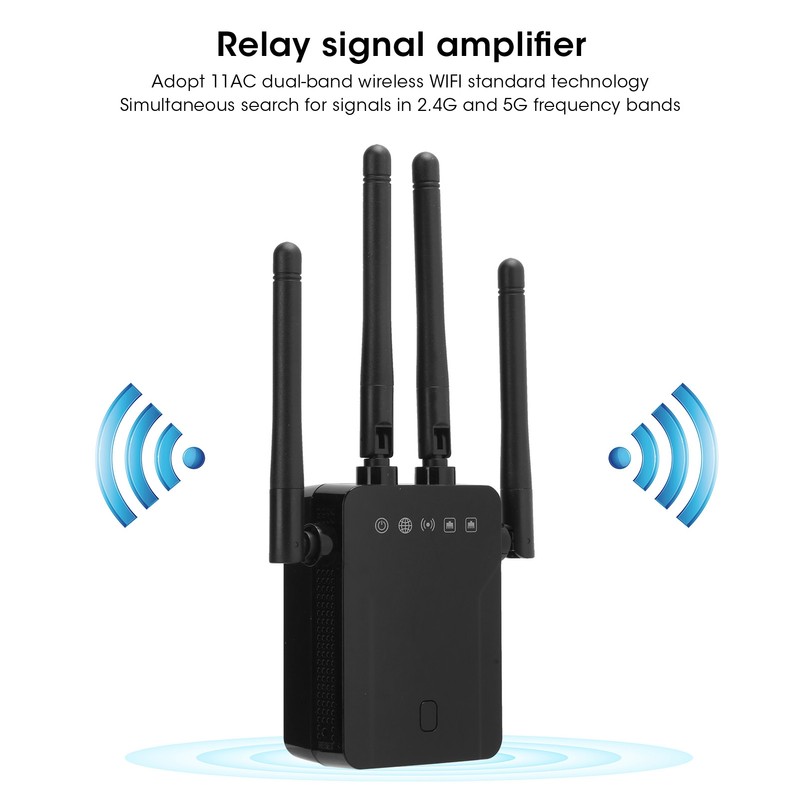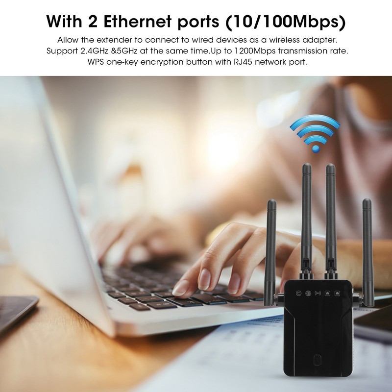 1、Relay signal amplifier combined with 11AC dual-band wireless WIFI standard technology. 2、The repeater can search for network signals in the 2.4G and 5G frequency bands at the same time, with a maximum transmission rate of 1200Mbps (2.4G/300Mbps and 5G/867Mbps). 3、Use the 5GHz channel to transmit data with low interference and excellent performance, and you can wirelessly enjoy high-speed Internet surfing like a wired network. 4、Equipped with four external antennas to provide better wireless performance, transmission rate, and stability technology to automatically avoid channel conflicts. 5、In addition, 2 Ethernet ports (10/100Mbps) are also configured to allow the extender to be used as a wireless adapter to connect wired devices. 6、The use of three-sided heat dissipation design greatly improves the heat dissipation effect of the machine when working, and effectively ensures the stability and life of the machine for a long time. 7、Small size and wall‑mounted design make it easy to deploy and move flexibly without taking up space. 8、WPS one‑key encryption button, RJ45 network port supports wired access, and supports 2.4GHz &5GHz at the same time, up to 1200Mbps.