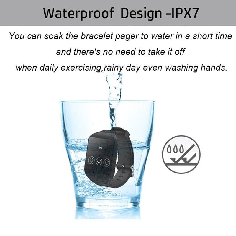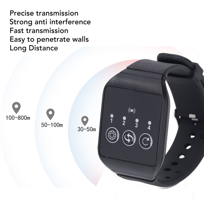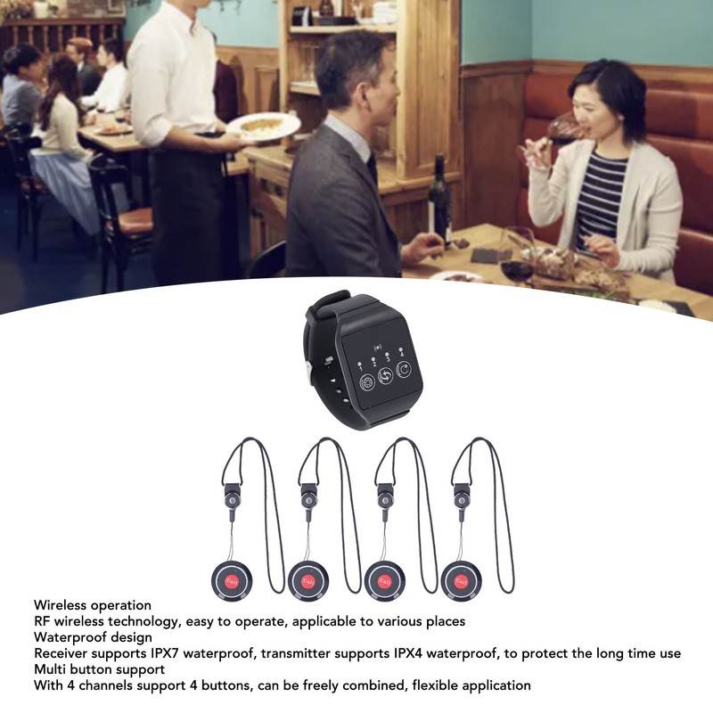 1、WIRELESS OPERATION: Wireless restaurant service calling system adopts RF wireless technology, which is convenient to operate and suitable for various places. 2、WATERPROOF DESIGN: The watch receiver supports IPX7 waterproof, and the transmitter supports IPX4 waterproof, guaranteeing long time use. The operating frequency is 433.92MHz, high sensitivity. 3、SUPPORT MULTIPLE BUTTONS: Wireless caregiver pager calling system has 4 channels, supporting 4 buttons, which can be freely combined and flexibly applied. 4、LONG ENDURANCE: Wireless restaurant paging system built in high capacity battery, long standby time, rechargeable battery, low power consumption. 5、APPLICABLE PLACES: Wireless guest customer calling system is suitable for home, factory, hospital and other places to protect the elderly care, emergency call.