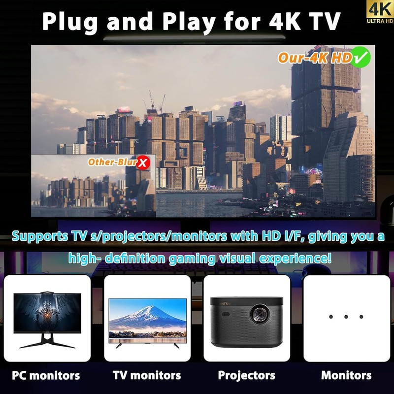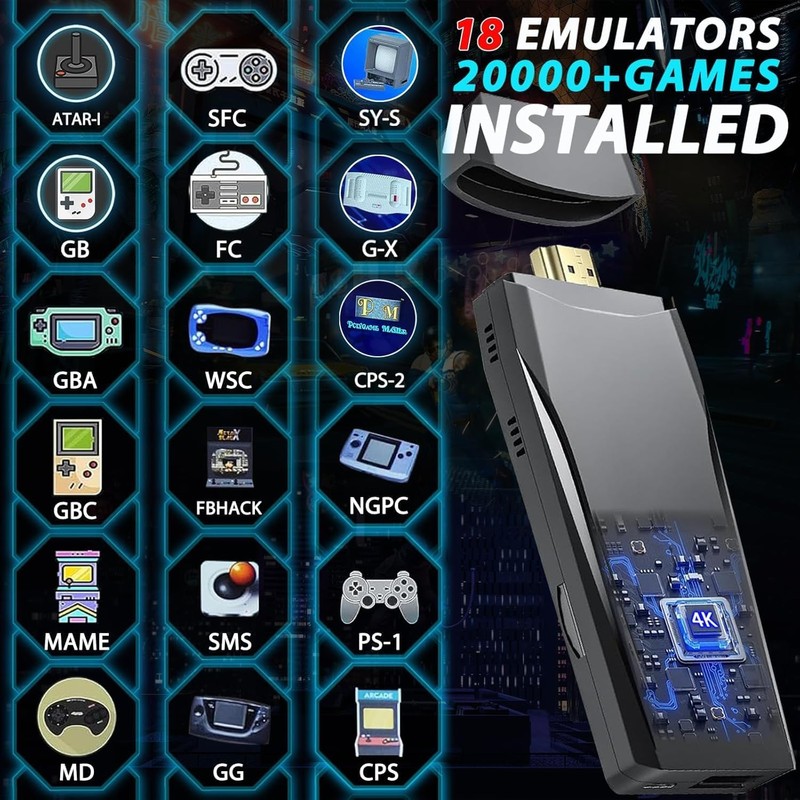 • 【4K High-definition HDMI Output】The retro game console supports 4K HD output, with clearer picture quality, you can enjoy retro video games on a big TV screen by using the mini HDMI cable connect to the TV. Please make sure your screen has an HDMI input port. The wireless TV game console can connect to TV/TV Set-top Box/PC/Laptop/Projector. The retro gaming stick also support saving game progress, perfect for gaming at any time.Games Console.