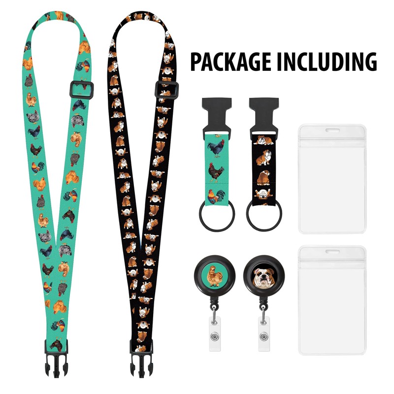 WIRESTER Set of 2 Cruise Lanyards with ID Holder and Buckle, Retractable Badge Reel Holder for All Cruises Ships Key Cards Men Women - English Bulldog Funny Playful Postures, Chicken Pattern