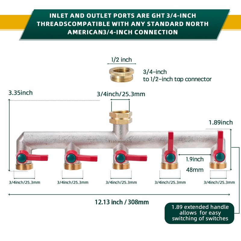 - Der Abstand zwischen den Wasserauslässen ist groß genug, um größere Anschlüsse, wie zum Beispiel größere Zeitschaltuhren, unterzubringen und den täglichen Bedarf im Haushalt zu decken.Fünf Wasser Geteilter Auslauf erfüllen noch mehr Ihrer Bedürfnisse und ermöglichen Ihnen die gleichzeitige Durchführung mehrerer Aktivitäten, wie automatische Bewässerung, Autowaschen, Bodenwaschen, Baden von Haustieren, im Wasser spielende Kinder usw.Erreicht wirklich mehrere Dinge mit einer Klappe.