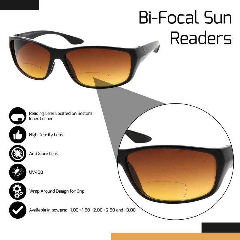 Wise Eyewear 2 Pair Bifocal Sun Reader Sport and Wrap Around Reading Sunglasses - Amber Tint Great for Driving and Fishing - Men and Women (1 Black 1 Tortoise, 3.00)