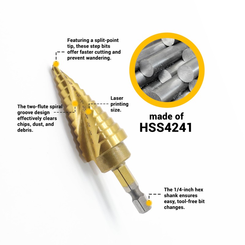 • "Perfect for Metal Drilling: Featuring a split-point tip, these step bits offer faster cutting and prevent wandering, ensuring accurate, centered holes in metal. Ideal for professionals and DIY enthusiasts alike."